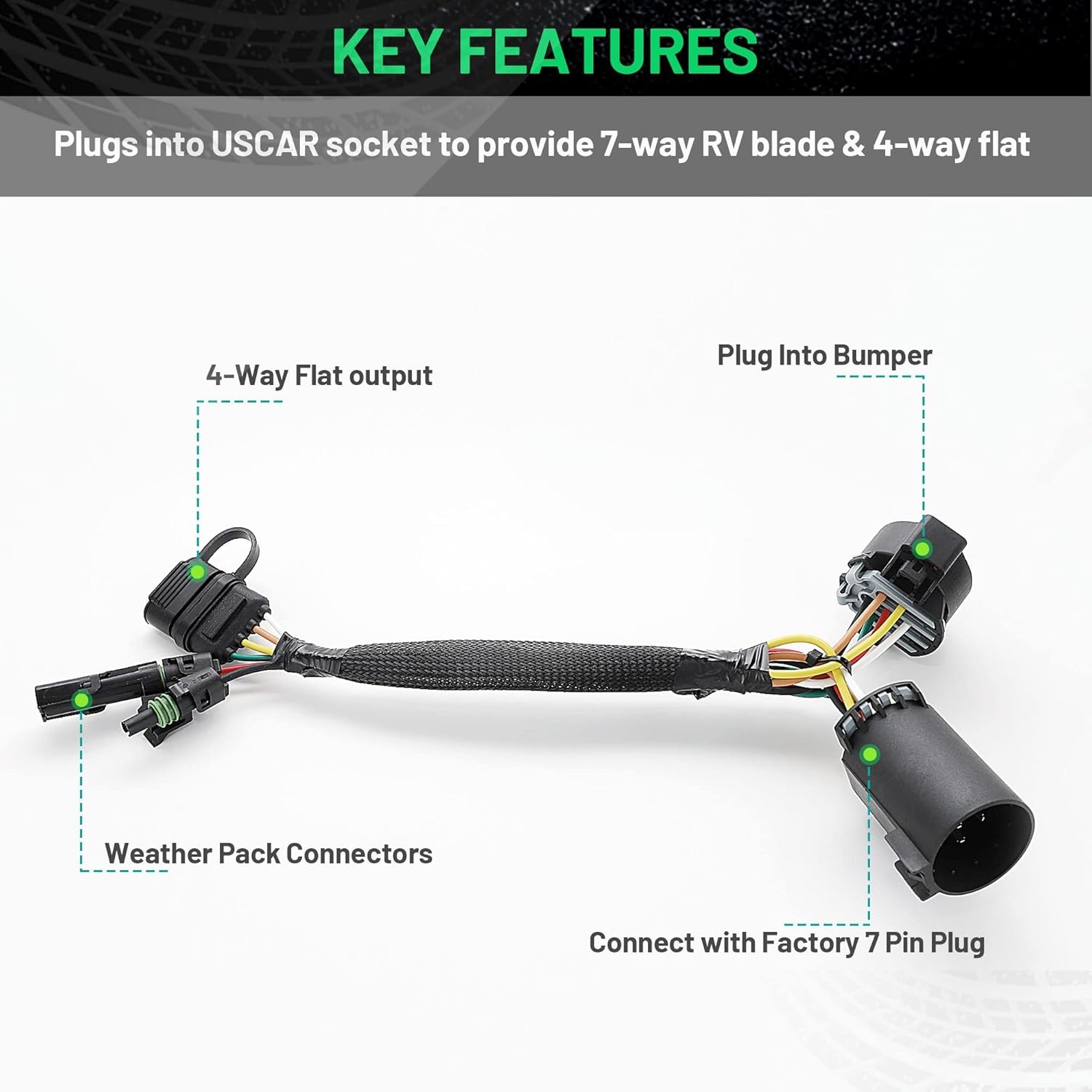 Universal Fit for Truck 7 Pin: Design for truck with factory OEM USCAR 7-way plug (standard USCAR socket 7-way connector) Compatible with Ford, Dodge, Nissan, Jeep, Ram, Audi, Chrysler, Dodge, Porsche, Ram, Toyota, Volkswagen and most GM Vehicles with factory tow package and factory 7 pin