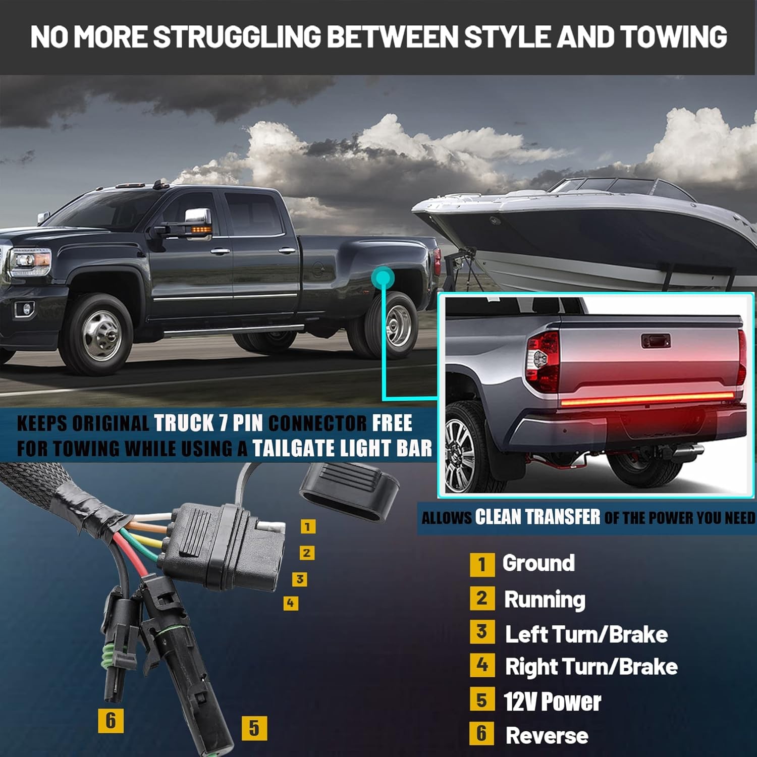 Round 7 Pin for Trailer: Plugs USCAR connector into the back of your truck end 7 pin trailer wiring, allow a spare socket for your tailgate light bar to keep your vehicle neat and clean. Creates an additional 4-pin connection for light bars or others requiring a 4-pole lighting connection