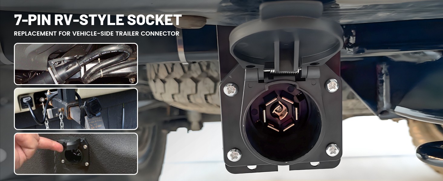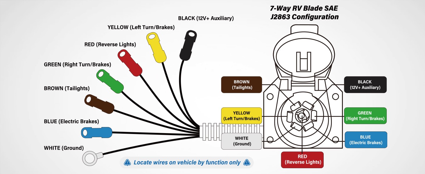 RV 7-Way Trailer Connector: - 7-Blade, RV-style trailer connector for vehicle side. 7-Way connects to towing vehicle's wiring provides full function 7-way connection to power trailer's taillights, brake lights, turn signals, reverse lights, electric trailer brakes and auxiliary power (12V+ wire)